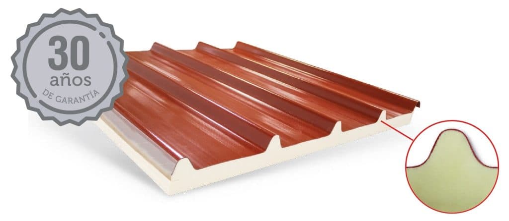 Por otro lado, la chapa exterior del panel está hecha de acero galvanizado prelacado, en una gran variedad de colores, siendo los más comunes el rojo, verde y gris pizarra. Esta capa no solo añade un atractivo visual a la estructura, sino que también proporciona una protección adicional contra los elementos exteriores, como la lluvia y el sol.
